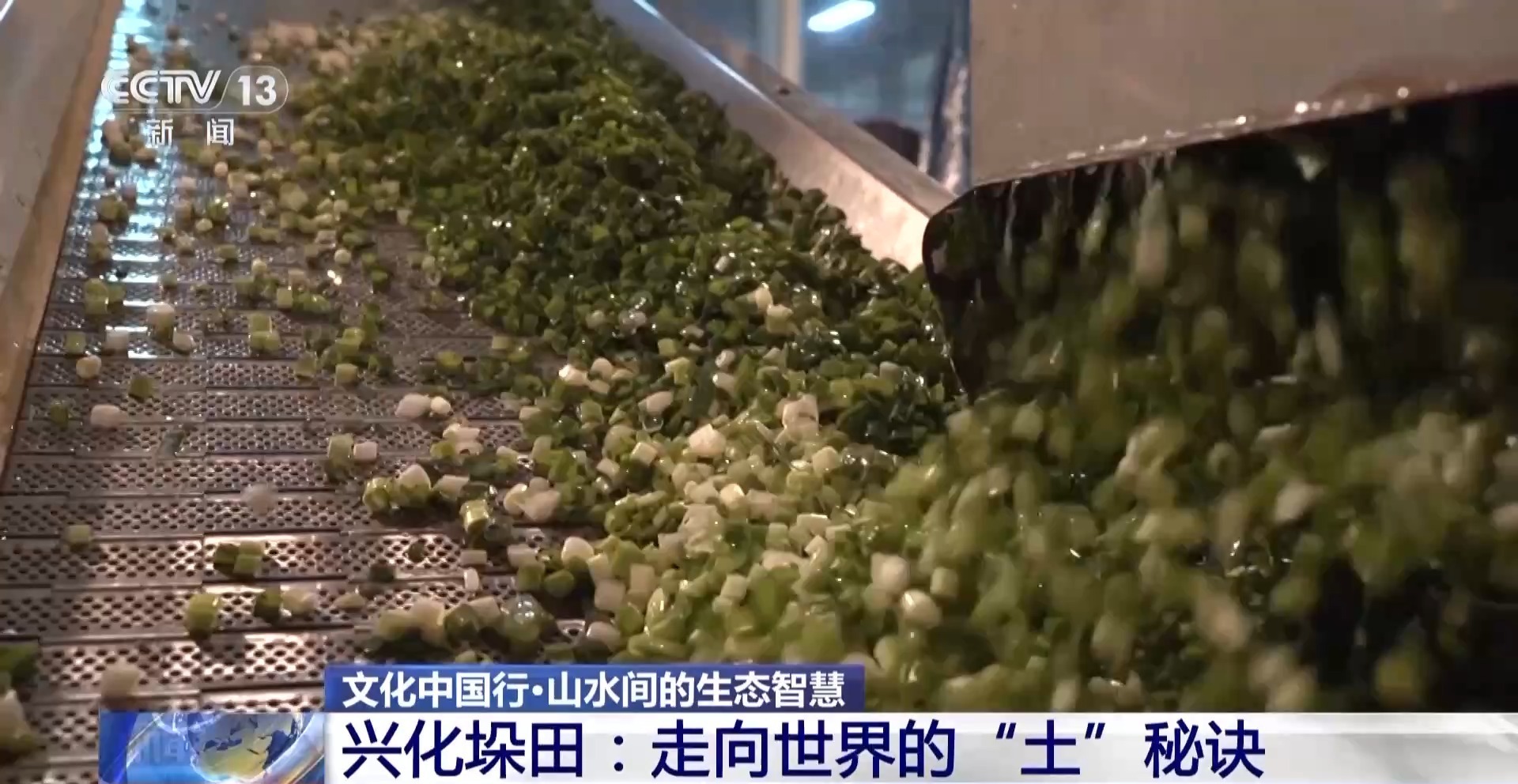 总台央视记者 周培培:现在是垛田香葱收获的季节,这里的葱相当特别,秘诀就在这个土里,这个土是从旁边的河道里起的淤泥,长期覆盖形成的一种土,因为营养丰富,所以这里长出来的葱有一种特别的香味。也因此垛田香葱从上世纪60年代开始就出口到日韩等很多国家,现在因为有新的科技加持,这颗小葱在接下来的48小时之内,将会迎来一场华丽的蜕变之旅。