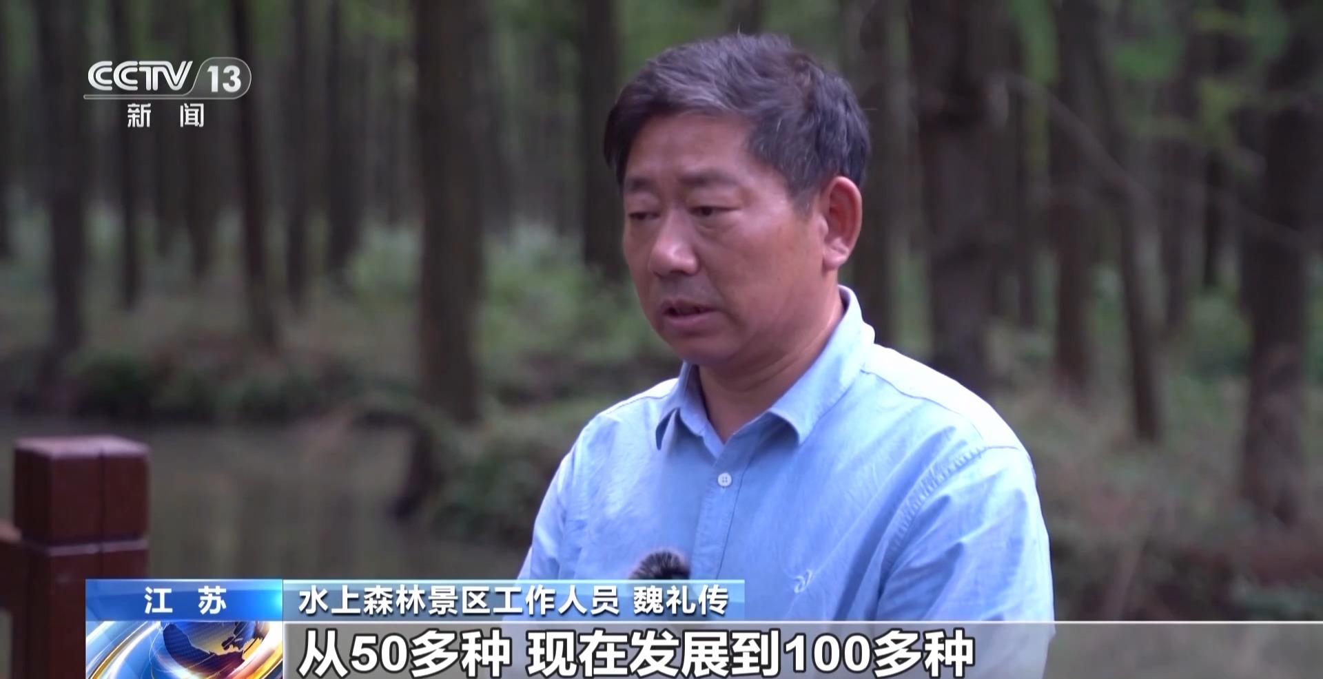 水上森林景区工作人员 魏礼传:从50多种,现在发展到100多种,然后从以前的几万只,现在发展已经产生了十几万只,都是国家二级保护鸟类,白鹭、灰鹭,黄头鹭。
