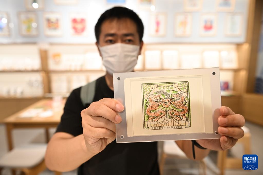6月6日,在中国电影资料馆江南分馆,一名参观者在开馆集章处展示用套色印章印出的“龙影成瑞”年画图案。