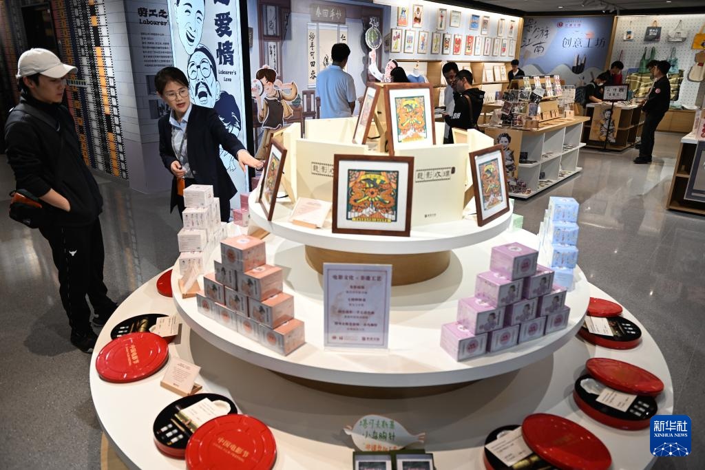 6月6日,中国电影资料馆江南分馆工作人员(左二)为观众介绍文创产品。