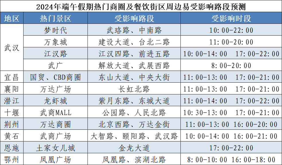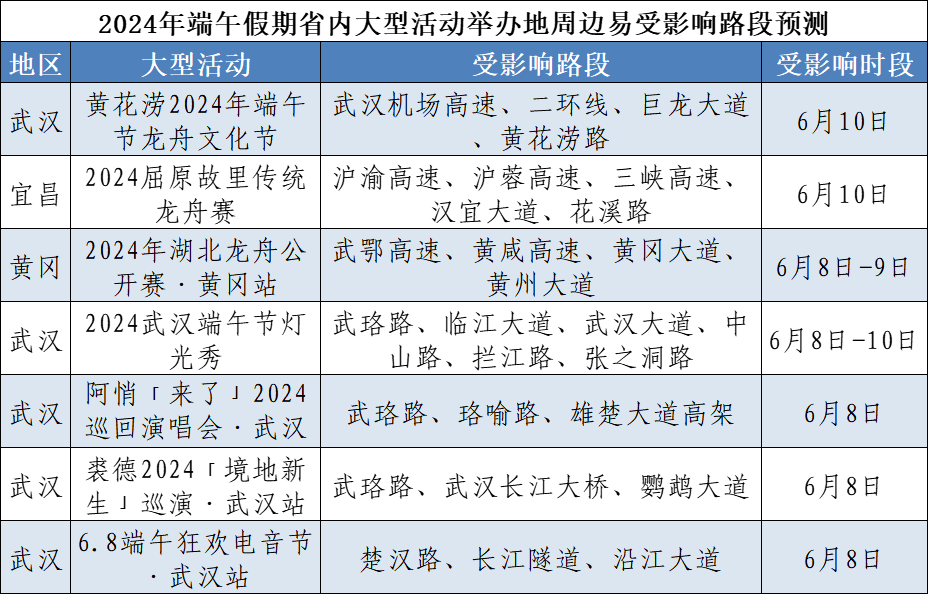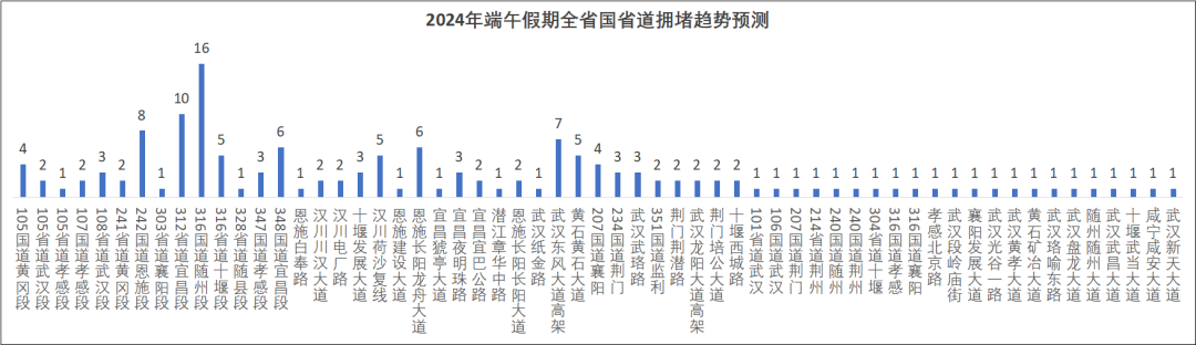 316国道随州、十堰段,312省道宜昌段,242国道恩施段、348国道宜昌段,105国道黄冈段,207国道襄阳段以及武汉东风大道高架、恩施长阳龙舟大道、汉川荷沙复线、黄石黄石大道等路段拥堵程度较高。