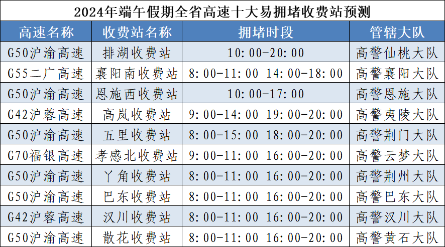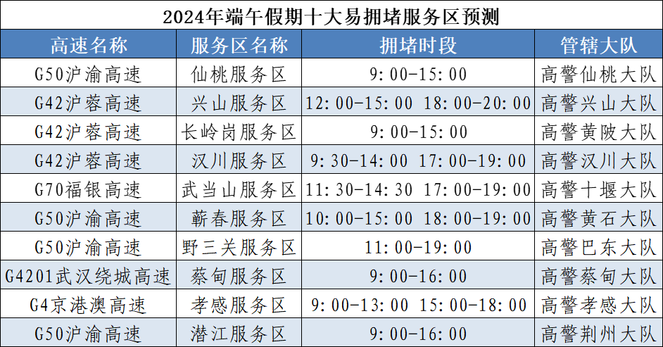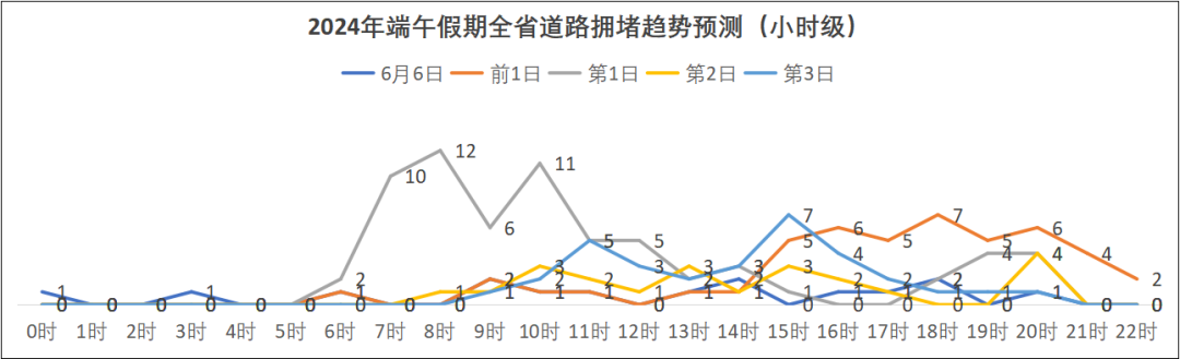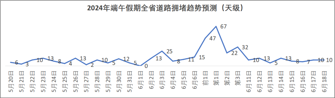 预计今年端午假期,拥堵时段主要集中在6月7日16~21时、6月8日9~12时、6月10日14~20时,其中第一日拥堵程度最高。
