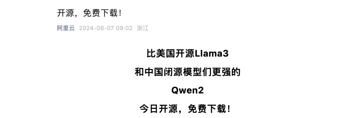 【环球网科技报道 记者 李文瑶】6月7日,阿里云更新技术博客,宣布发布开源模型Qwen2-72B。所有人均可在魔搭社区和Hugging Face免费下载通义千问最新开源模型。