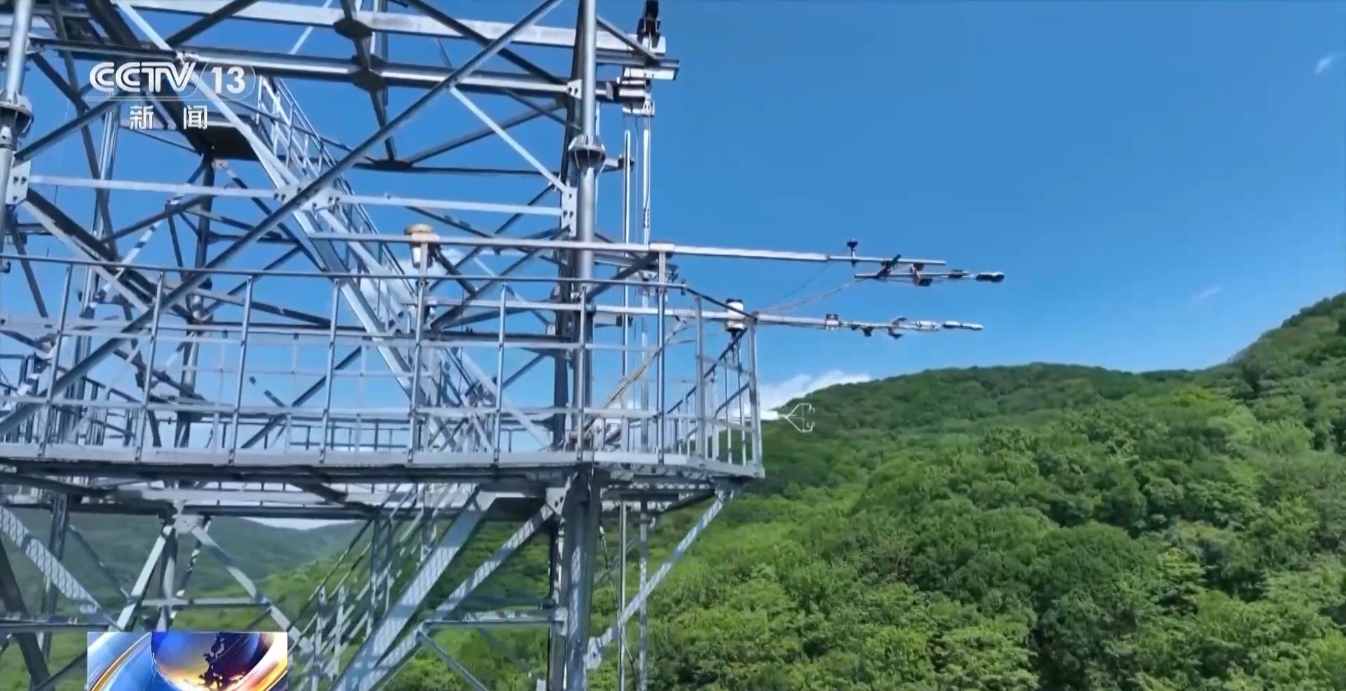 中国科学院清原森林生态实验站工程师 于丰源:这三个观测塔它们分别对应着不同的林形,像我们所在的1号塔对应的是典型次生林,另外还有两个观测塔对应的是蒙古栎林和落叶松林,每个观测塔高都是50米。