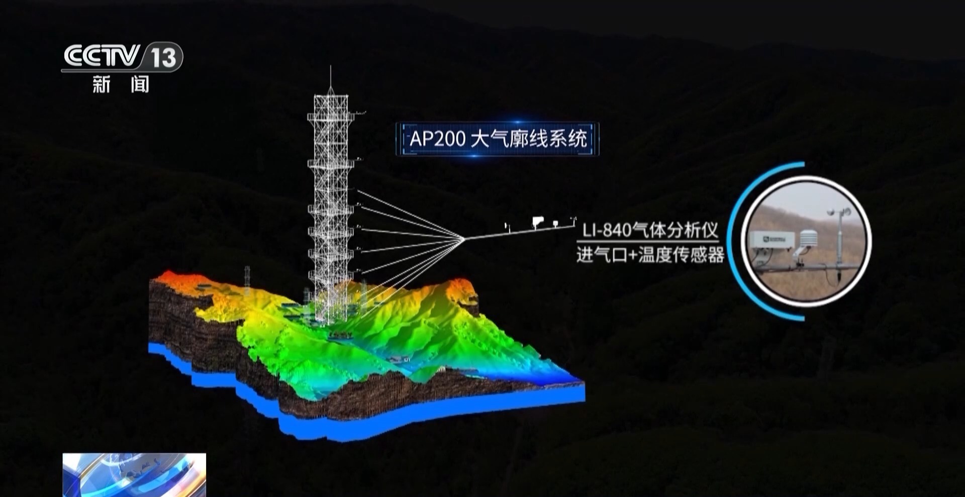 中国科学院清原森林生态实验站工程师 于丰源:它叫闭路涡动通量相关测量系统,最外面有像三个小爪爪,它叫三维超声风速仪,可以实时地监测风速和风向的变化。
