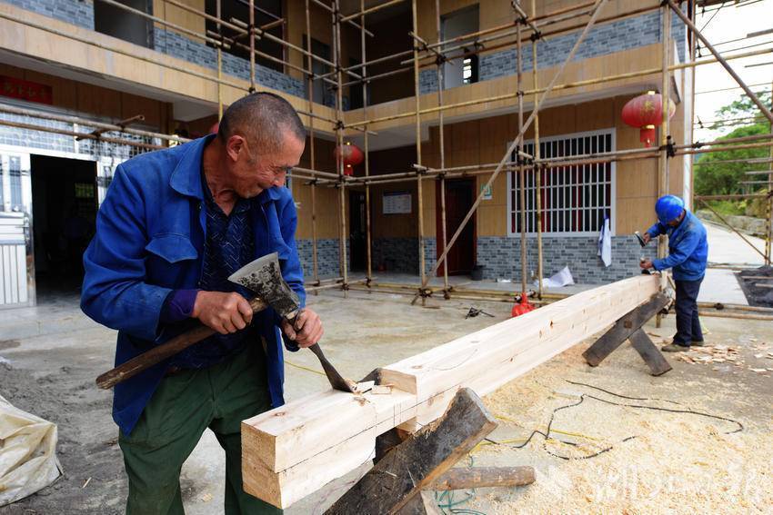 6月6日,在咸丰县黄金洞乡水杉坪村一处吊脚楼营造技艺施工现场,国家级非遗项目土家族吊脚楼营造技艺州级代表性传承人姜胜建(左)在制作吊脚楼的梁木。李维君摄