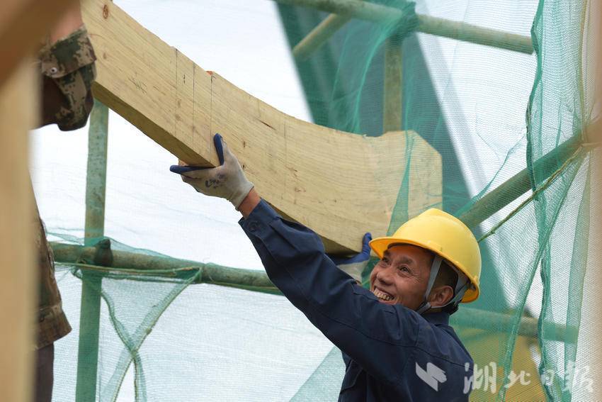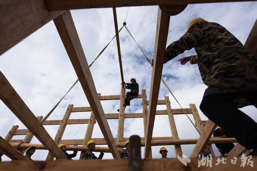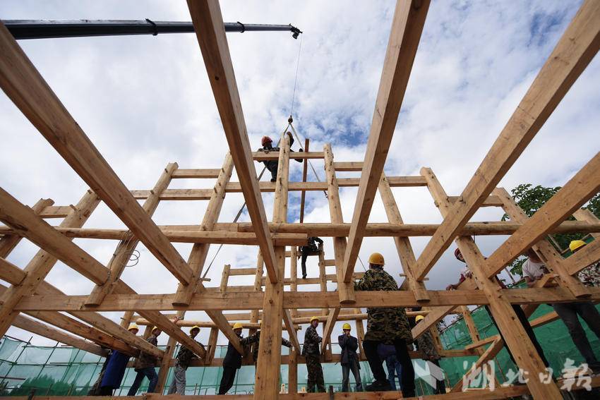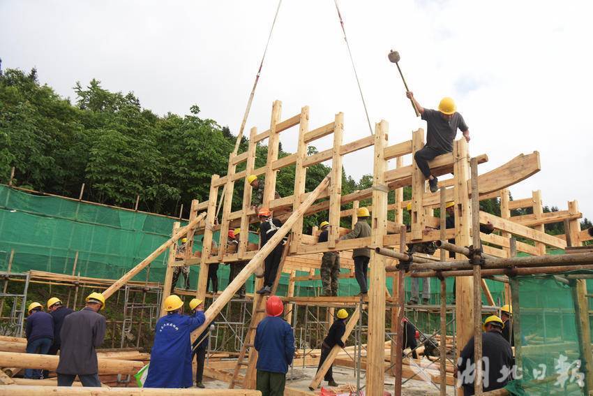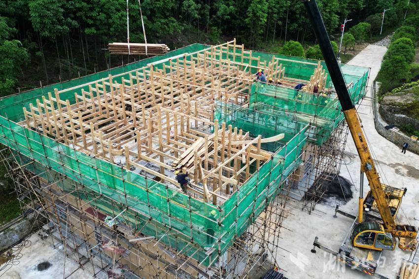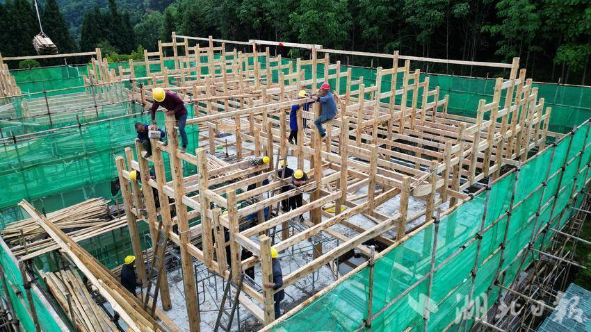 湖北日报客户端讯(通讯员李维君)6月6日,在咸丰县黄金洞乡水杉坪村一处吊脚楼营造技艺施工现场,民间艺人在起重机的配合下,将拼装好的吊脚楼立到屋基上。有起重机、脚手架、防护网和电动工具的加持,在降低成本、提高工效的同时,劳动者的安全也得到了科学保障。