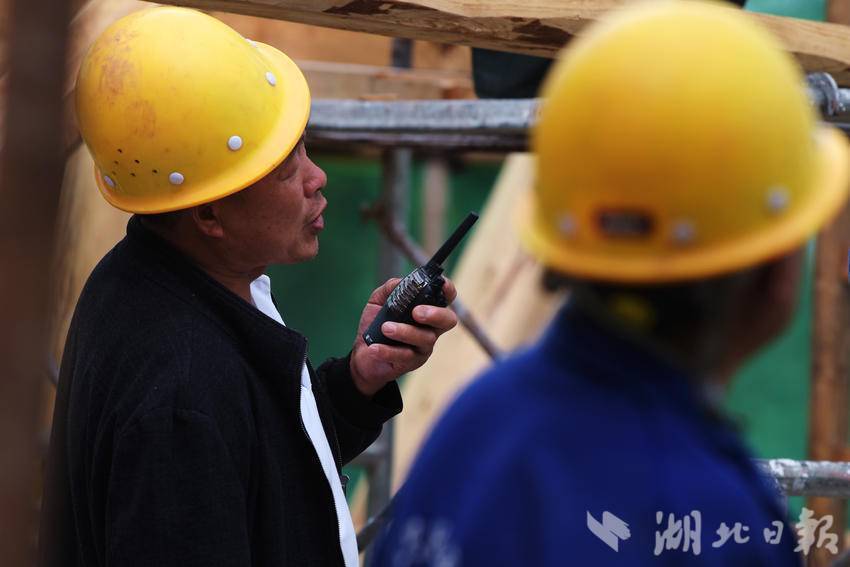 6月6日,在咸丰县黄金洞乡水杉坪村一处土家族吊脚楼营造技艺施工现场,工作人员用对讲机指挥起重机精准吊装。李维君摄