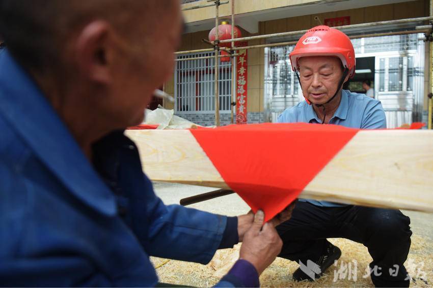 6月6日,在咸丰县黄金洞乡水杉坪村一处吊脚楼营造技艺施工现场,国家级非遗项目土家族吊脚楼营造技艺县级代表性传承人李文曲(右)在“包梁木”。李维君摄