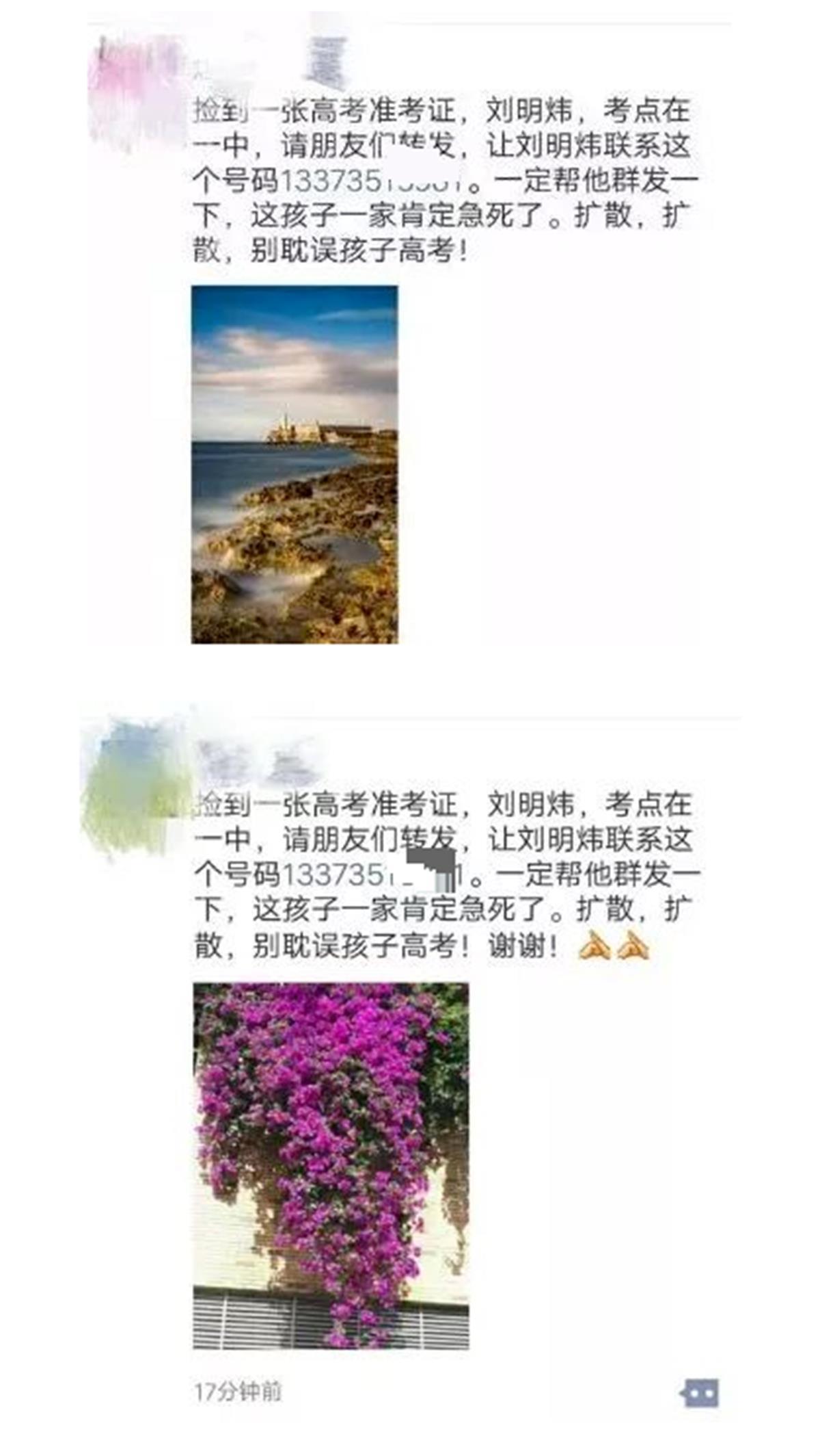 “捡到一张高考准考证,XXX,考点在一中,请朋友们转发,让XXX联系这个号码1560633****。一定帮他群发一下,这孩子一家肯定急死了。扩散,扩散,别耽误孩子高考!”
