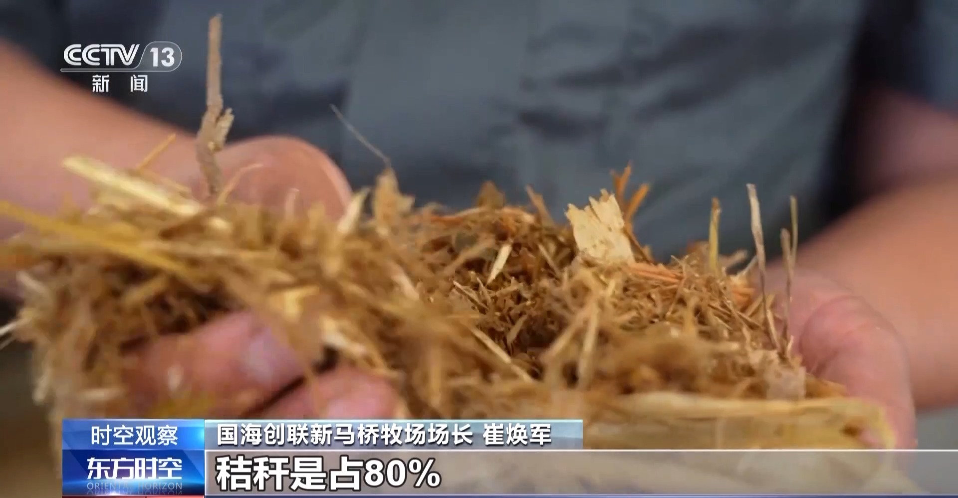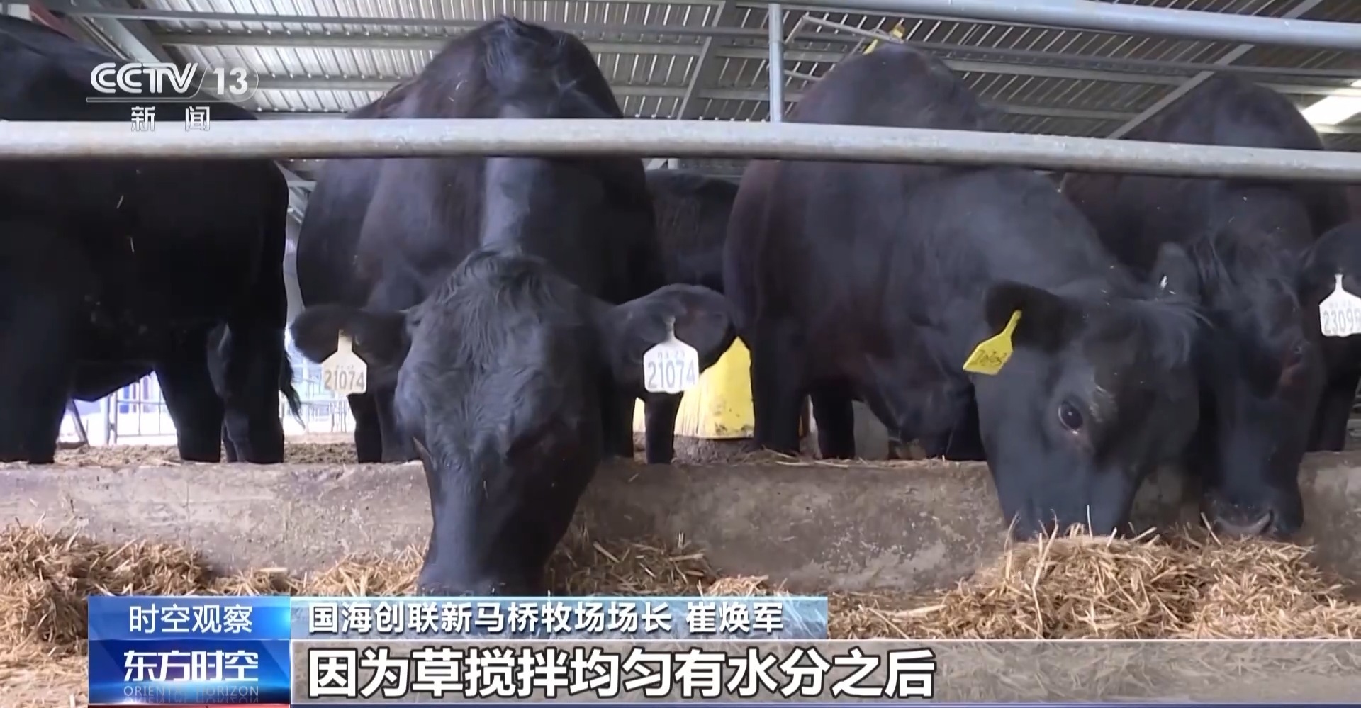 国海创联新马桥牧场场长 崔焕军:我们全群存栏是1200头,每头牛每天的秸秆使用量在10公斤左右,全群每天的使用量是12吨左右。现在是麦收阶段,新的秸秆也下来了,我们的牛可以吃到新口粮了。