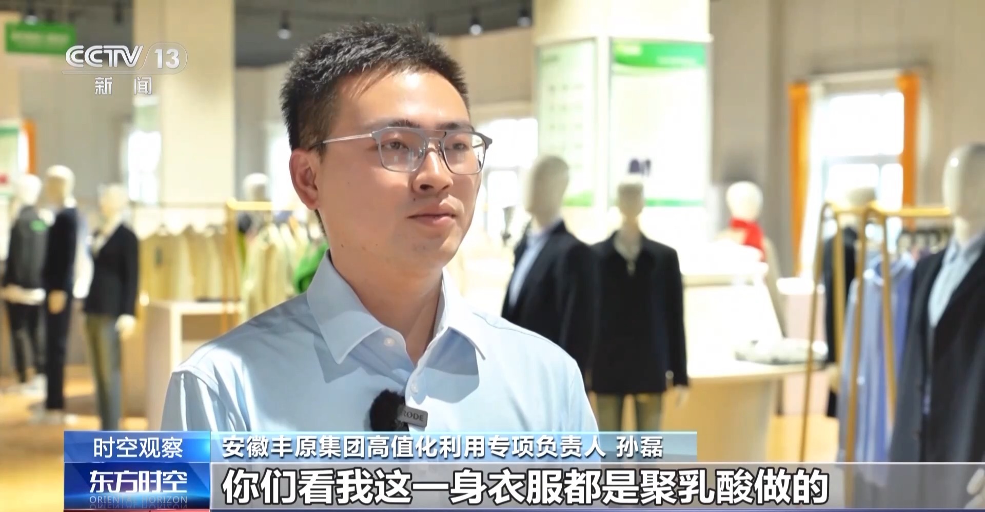 安徽丰原集团高值化利用专项负责人 孙磊:我这一身衣服都是聚乳酸做的,我们以秸秆为原料,经现代生物发酵技术,能生产出一系列纤维、塑料替代制品。