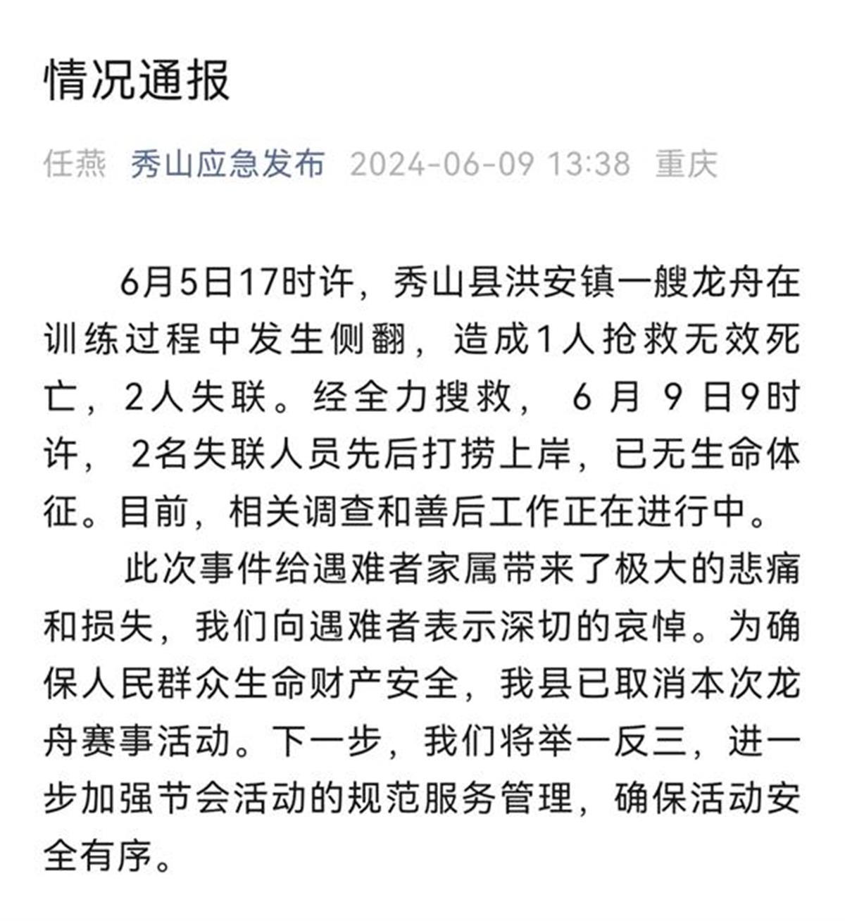 9日上午,重庆市秀山土家族苗族自治县应急局发布通报称,6月5日下午5时许,秀山县洪安镇一艘龙舟在训练过程中发生侧翻,造成1人抢救无效死亡,2人失联。经全力搜救,6月9日9时许,2名失联人员先后打捞上岸,已无生命体征。目前,相关调查和善后工作正在进行中,秀山县已取消本次龙舟赛事活动。