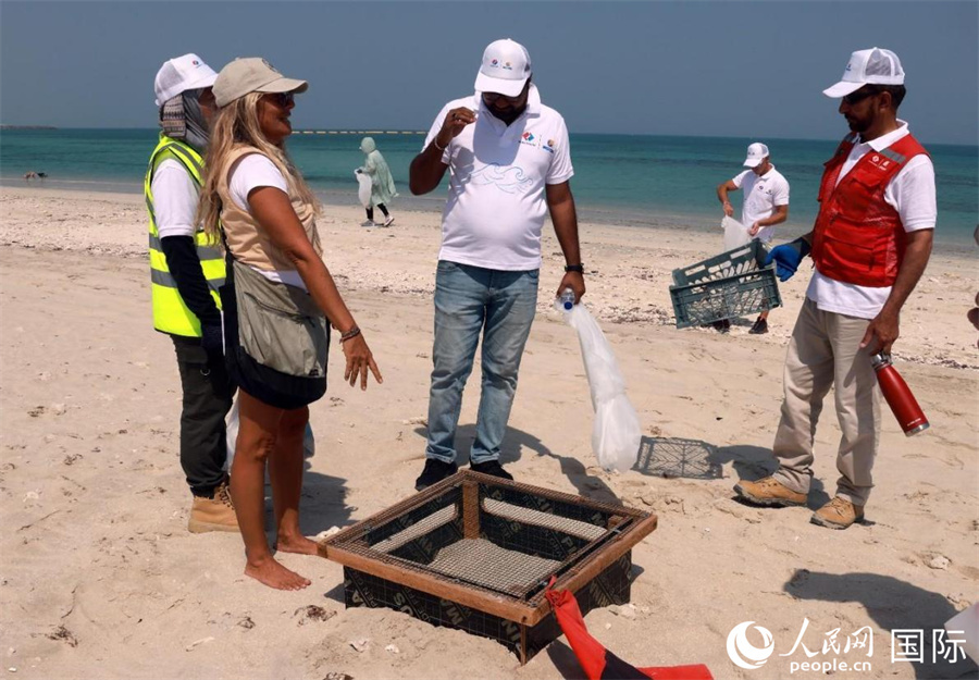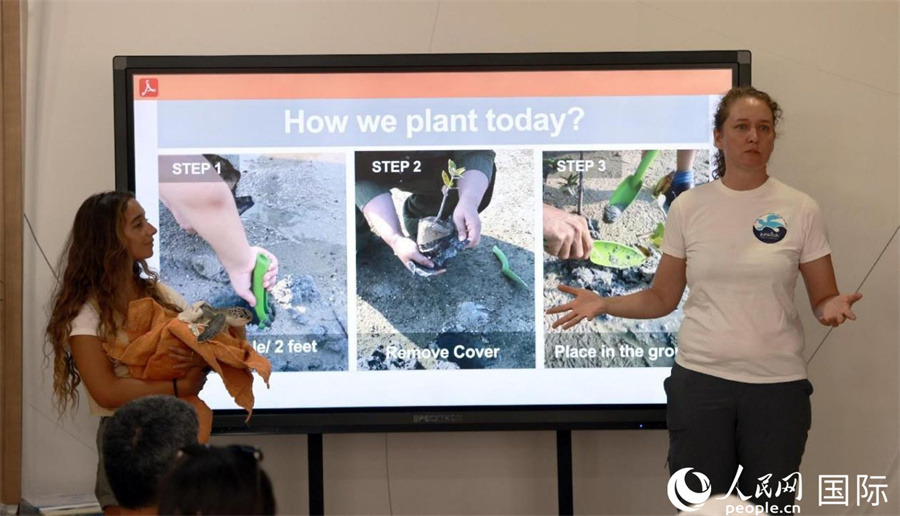 阿联酋海洋环境集团专家(左二)介绍海龟产卵保护方案。人民网记者 管克江摄