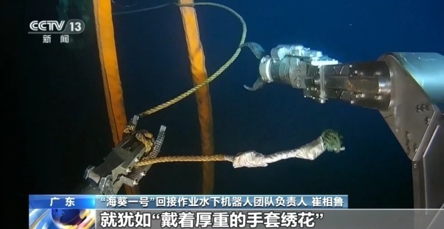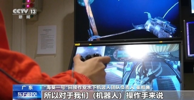 “海葵一号”回接作业水下机器人团队负责人 崔相鲁:水下机器人的机械臂有零点几秒的延时,所以对于机器人操作手来说要有一个提前的预判。