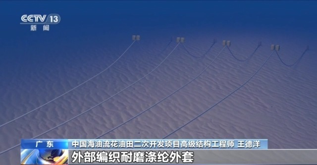 中国海油流花油田二次开发项目高级结构工程师 王德洋:“海葵一号”的锚腿由多段聚酯缆、锚链有力连接而成。其中,聚酯缆以高强聚酯涤纶绳为内芯,外部编织耐磨涤纶外套,以及10万多根纤维组成一根整绳,直径仅274毫米。相比传统的钢缆,重量轻、成本低且更耐海水腐蚀、强度更高。