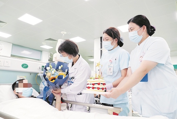 18年来,在医护人员的关心照顾和规范透析治疗下,冯师傅的病情也比较稳定。为庆祝他透析18周年,医护团队悄悄为他筹备了特殊的“生日会”。6月7日上午,肾病内科主任陈文莉、血液净化中心徐芳护士长等医护人员手捧着鲜花、蛋糕和定制的奖杯,来到冯师傅的床前。冯师傅激动地说:“感谢医护人员这么多年对我的精心照护,在生活和精神上给了很大支持,让我的心态也变得年轻。我有勇气,和你们一起走下去。”现场温馨的气氛和场面也感染了在场透析的病友。
