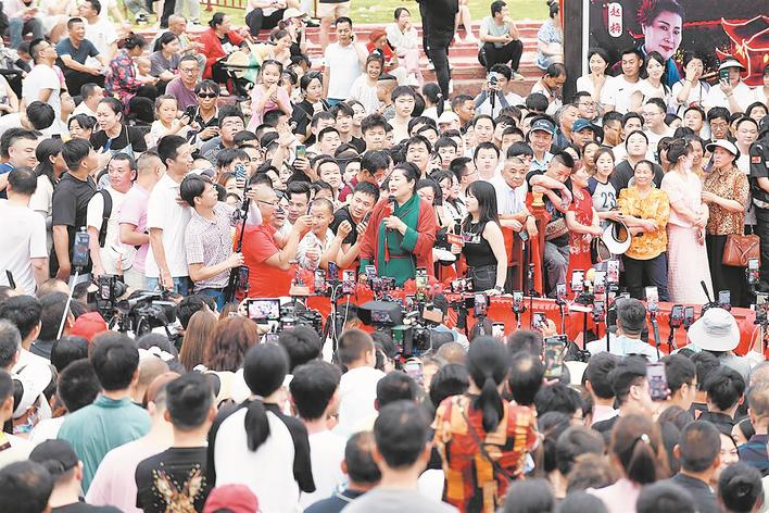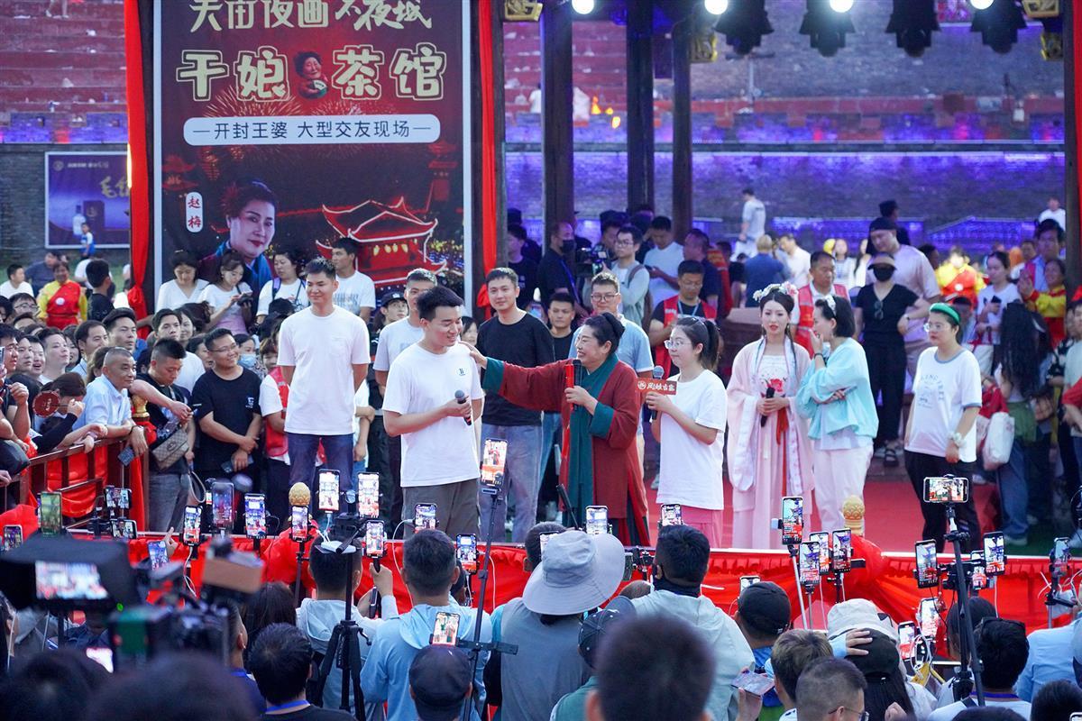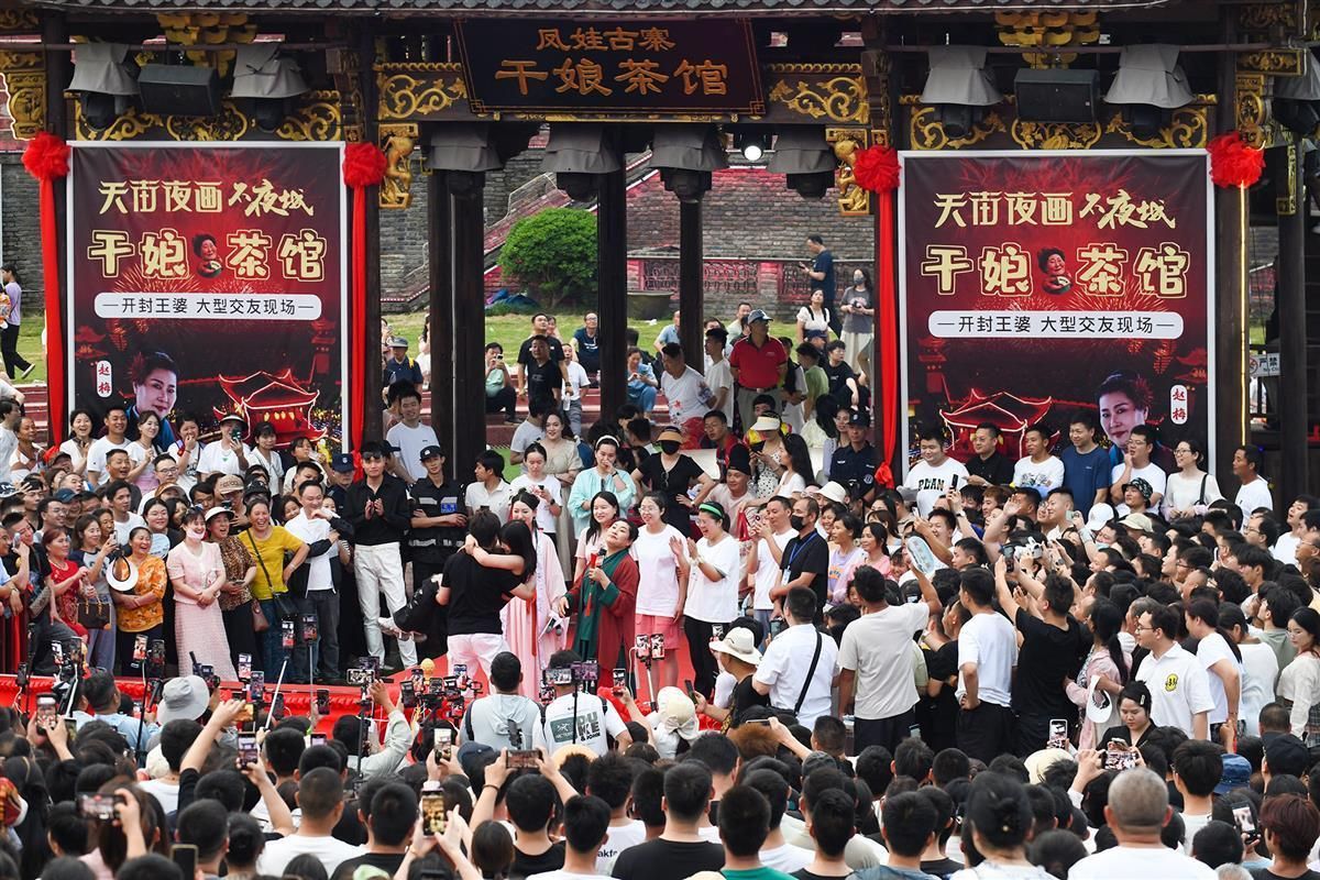 6月9日,端午节假期期间,今年火爆网络的河南开封相亲栏目“王婆说媒”主持人赵梅,现身武汉市新洲区凤娃古寨,引来3万多人前来打卡“干娘茶馆”,一场集相亲、游园、赏民俗的系列活动让游客直呼“过瘾”。