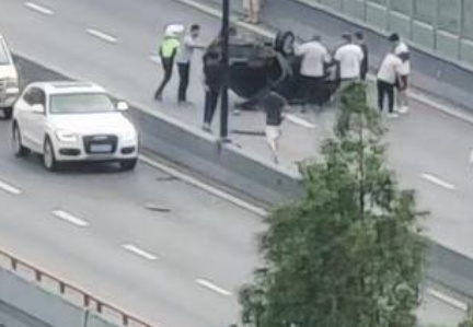 只见事故车辆整个翻在地