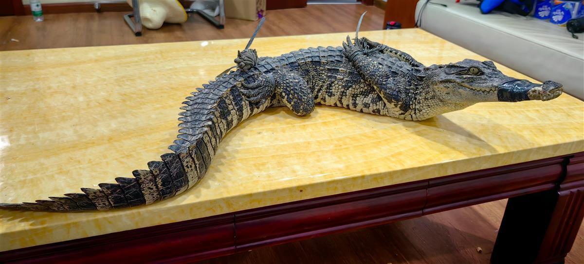 经鉴定,这条鳄鱼约为一岁半,雄性,幼体。测得其体长1.3米,体重13斤。