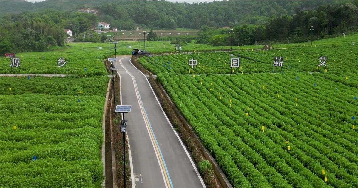 车行两车道多彩旅游路贯通的蕲州镇席盘石村道正蕲艾产业园,艾香扑鼻,香气怡人,交通驿站、露营基地、蕲艾工坊、直播基地、特色民宿、观景平台等不时闪过。