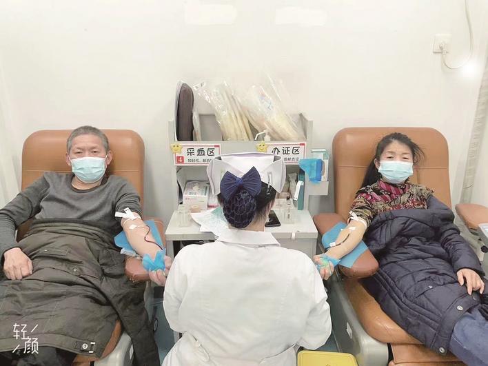热血家庭吕春风、李明艳夫妻二人挽袖献血。