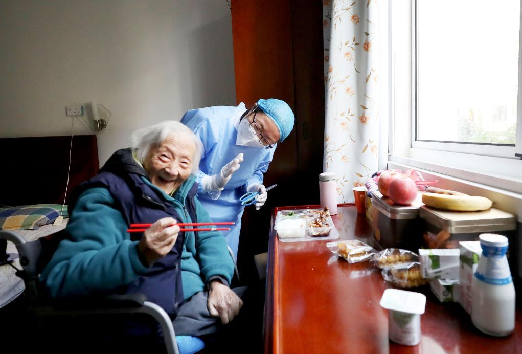 在上海中福会养老院,一名老人在工作人员帮助下吃饭。新华社记者 方喆 摄