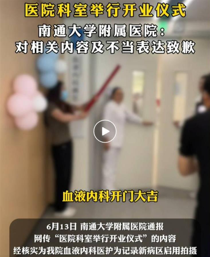 6月12日,网络视频显示江苏南通某医院一科室举行开业仪式,仪式中使用“开门大吉”“心想事成”“平平安安”“百事可乐”“平步青云”“一路生花”等词,相关消息引发网友热议。6月13日,涉事医院南通大学附属医院就此发布情况说明,并公开道歉。(据6月13日澎湃新闻报道)