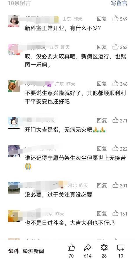 这种情景在乔迁或开业中比较常见,以表达祝福之意,并不为怪。医院科室新病区启用,如果低调处理,直接将办公用品搬过去就行,可以不必搞什么仪式感。如果想“整活”,以给这个特殊的开业日子留点纪念,也未尝不可。从上述祝福语可以看到,多数还是符合医院特点的,诸如“平平安安”“药到病除”之类,这于医患双方都是良好愿望的表达,并无不妥。