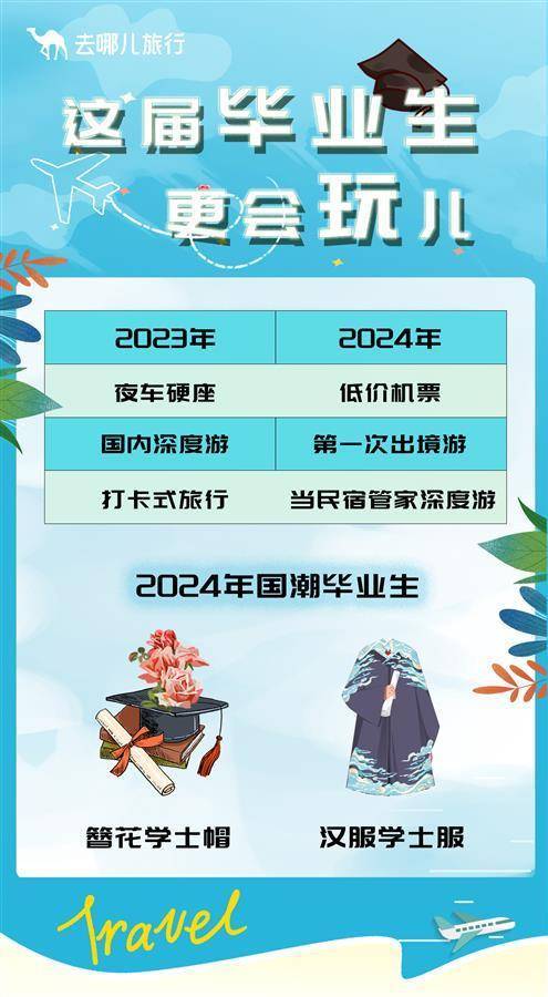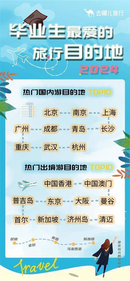 值得一提的是,今年不少人在毕业季开启了自己人生中第一次出境游。数据显示,今年6月出发的毕业生中,国际酒店预订量同比去年增长2.5倍。从出境游目的地看,毕业生出境游首站选择在了港澳和东南亚。去哪儿平台上,毕业生预订最多的出境目的地前十为中国香港、中国澳门、曼谷、大阪、东京、普吉岛、首尔、新加坡、济州岛和清迈。