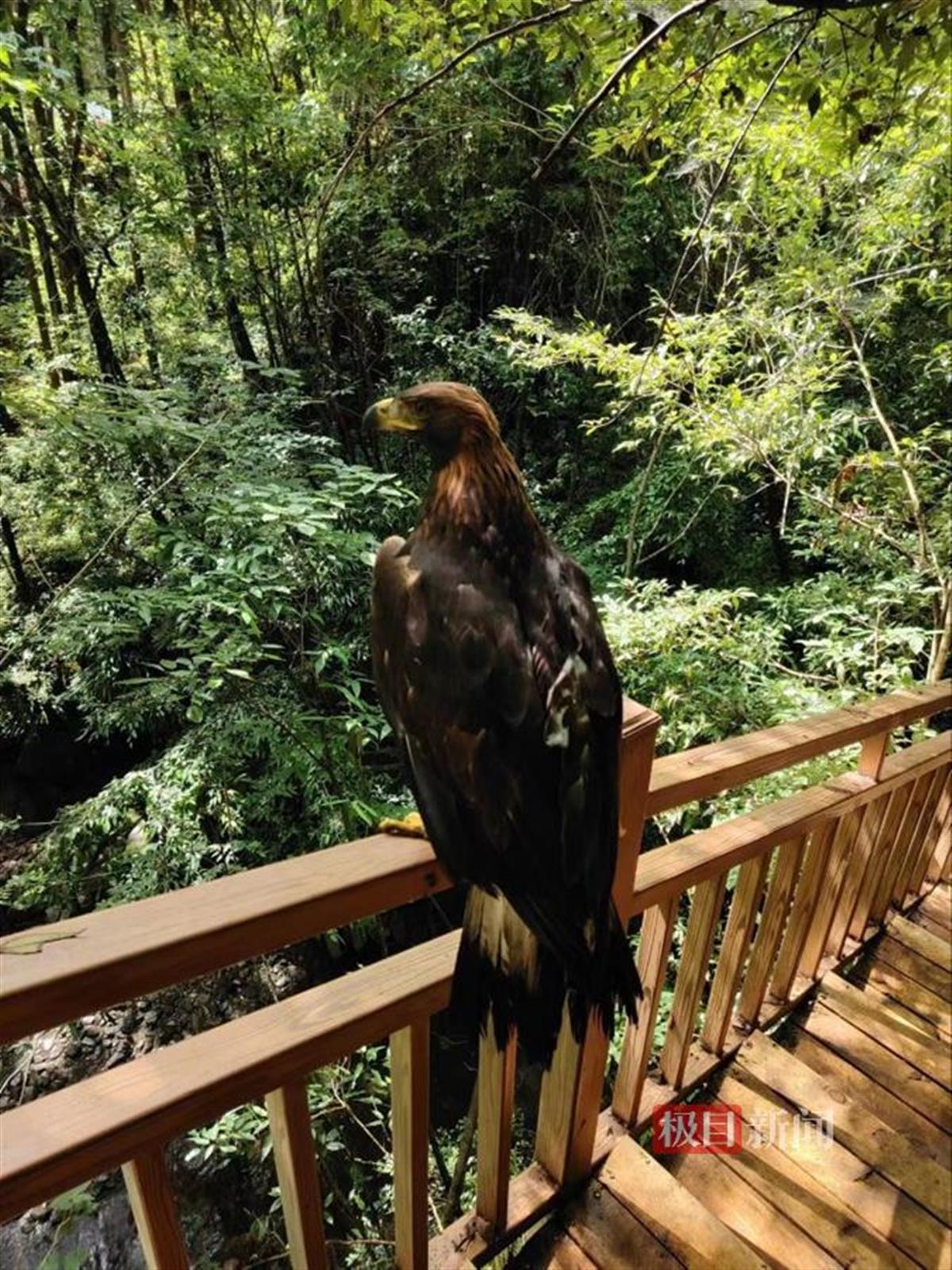 6月13日,湖北堵河源国家级自然保护区工作人员王道成,在竹山县官渡镇鲁班峡生态步行道栏杆上发现一只疑似金雕的动物,便忙着拿出手机拍摄。照片经过该保护区科研所确认,此鸟为国家一级重点保护动物金雕。