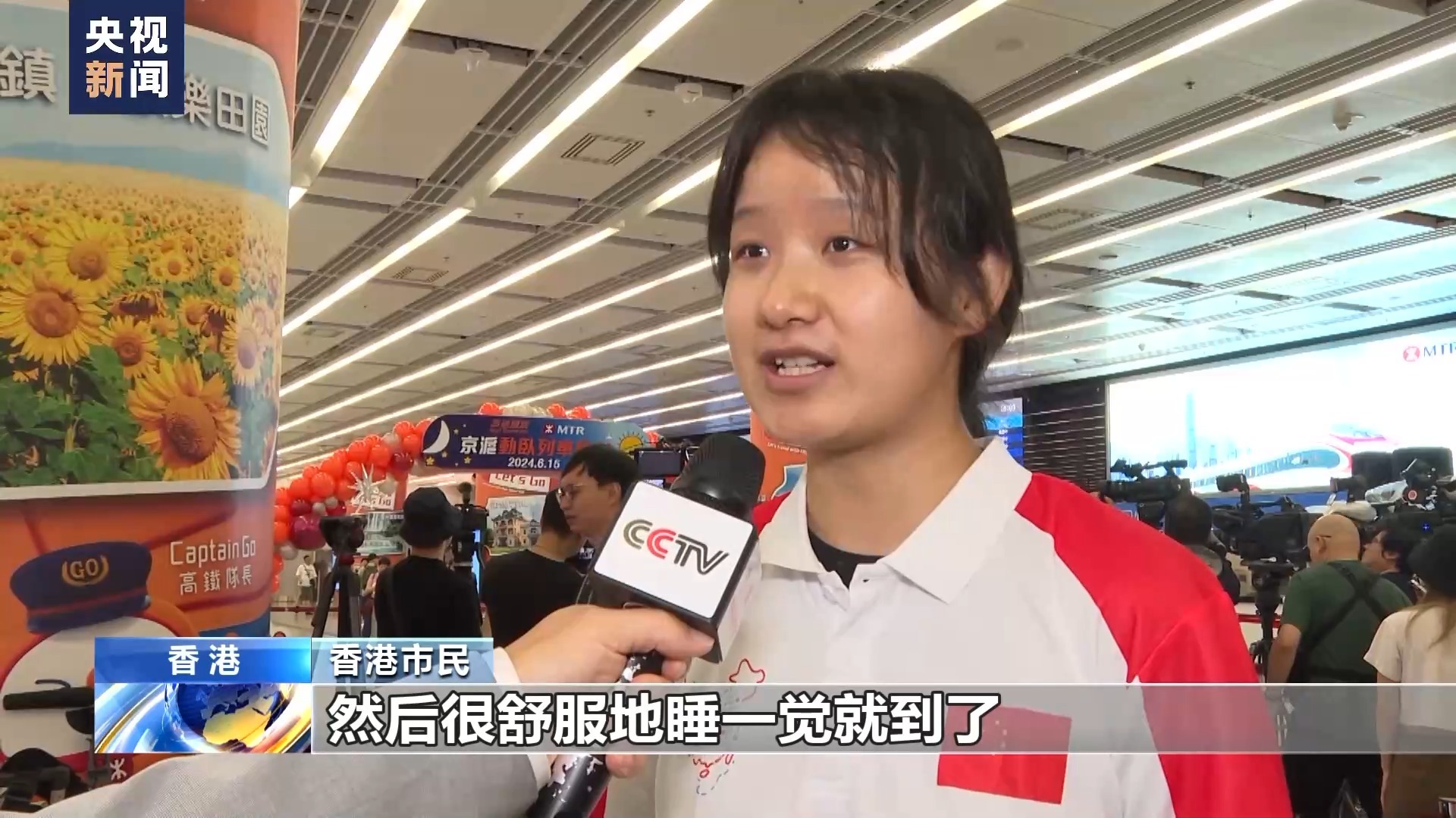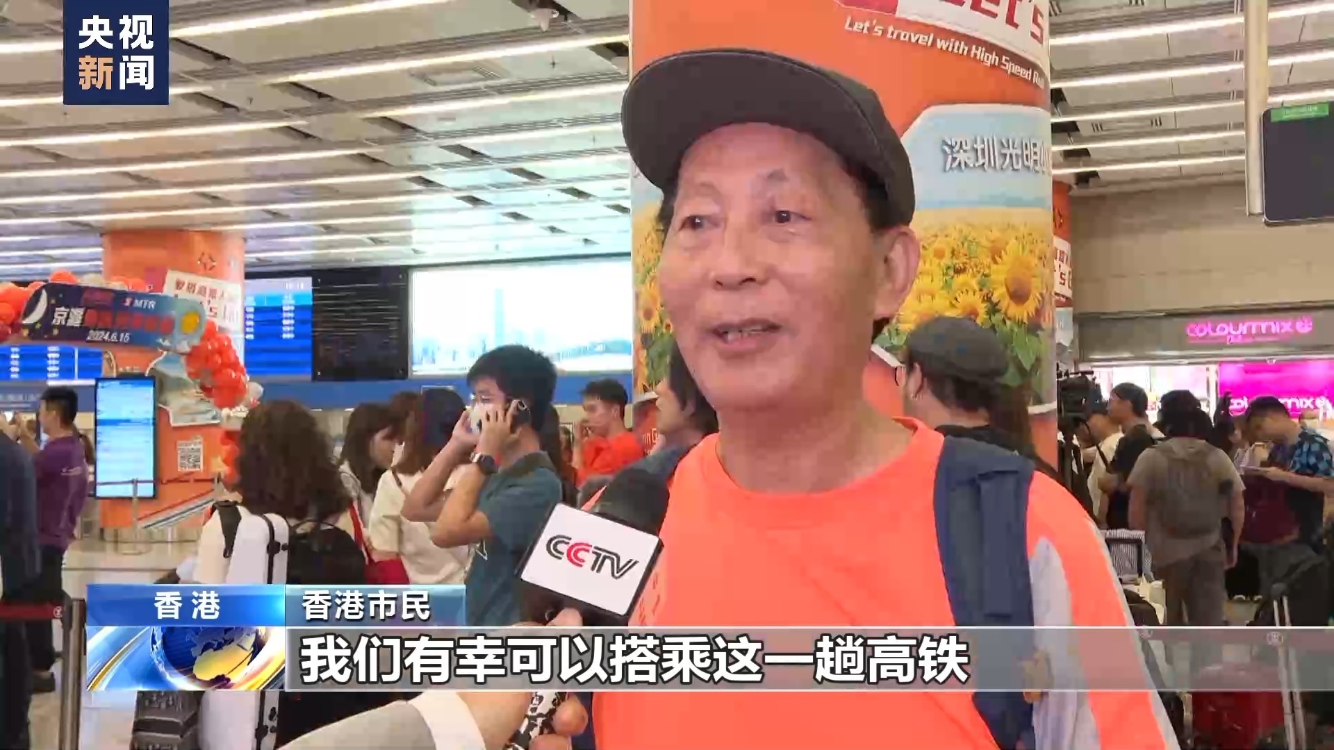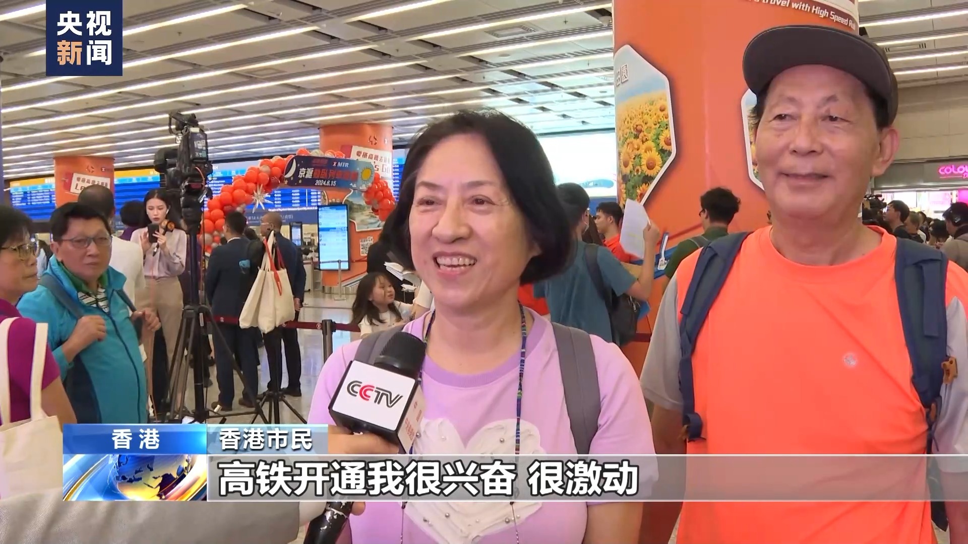 香港市民:我是在北京读的大学,所以我们的普通话没有问题,交流起来非常方便。这次的高铁开通,对于每一个香港同胞来说,其实都是一个很好很好的大喜事。尤其今天首日开通,我们有幸可以搭乘这一高铁,心里非常激动,也非常开心。