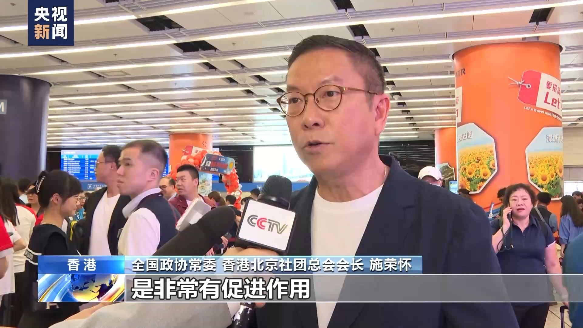 全国政协常委、香港北京社团总会会长 施荣怀:高铁开通对两地进一步的交流融合非常有促进作用,这也充分体现了国家支持香港融入国家发展大局里面。