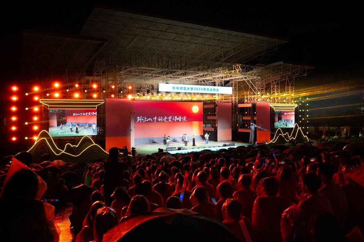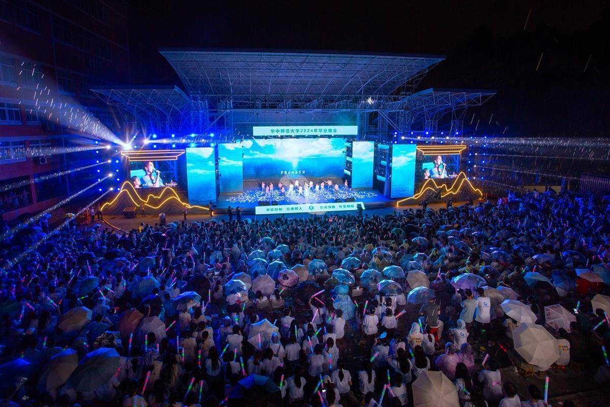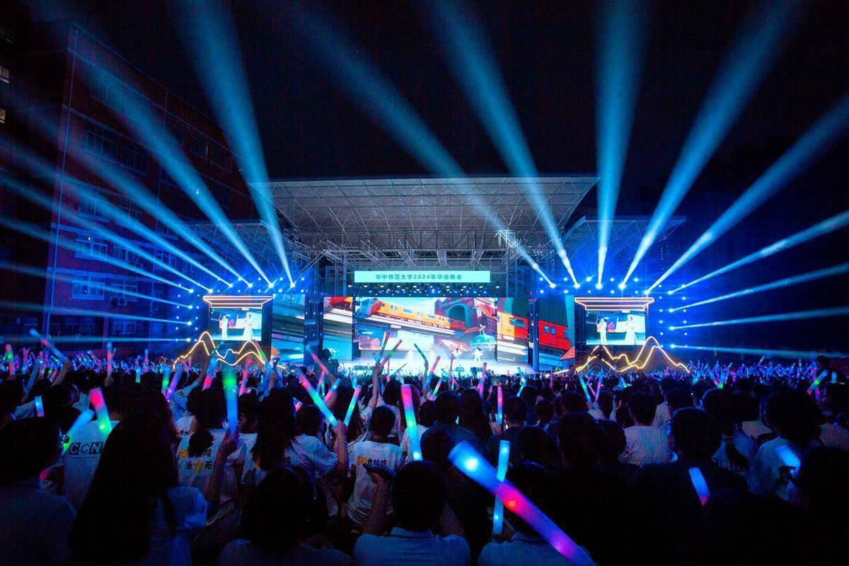 “毕业快乐!”6月16日晚,华中师范大学举行“梦起桂子山,携爱赴山海”2024年毕业晚会。师生们一边挥舞荧光棒一边欢呼,露天电影场上形成了一片动人的荧光灯海。