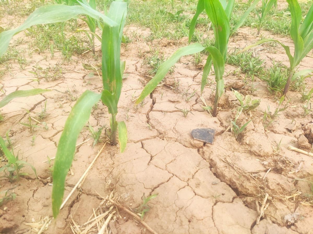 薛大爷麦地边的一块田地里,玉米苗已经长到二十多厘米高,但长势参差不齐。玉米地里出现大片的裂缝,最宽的裂缝有一厘米宽,显然是因为干旱所致。