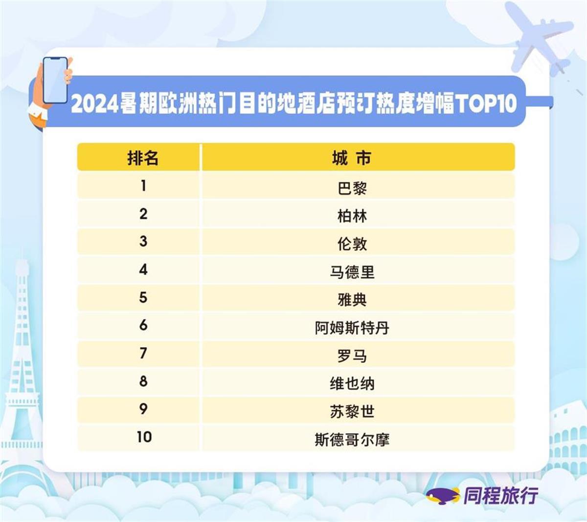 同程旅行平台上,巴黎及法国其他主要城市的旅游热度增幅在欧洲地区位居前列,柏林、伦敦、马德里等欧洲主要旅游目的地的热度紧随其后。
