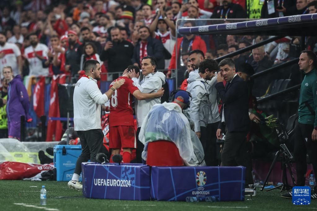 6月18日,土耳其队主教练蒙特拉(左三)拥抱被替换下场的球员居莱尔(左二)。新华社记者 潘昱龙 摄