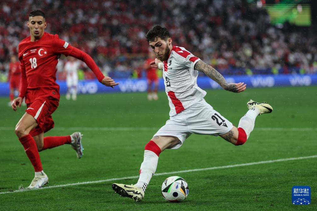 6月18日,格鲁吉亚队球员乔治·齐塔什维利(右)在比赛中射门。新华社记者 潘昱龙 摄