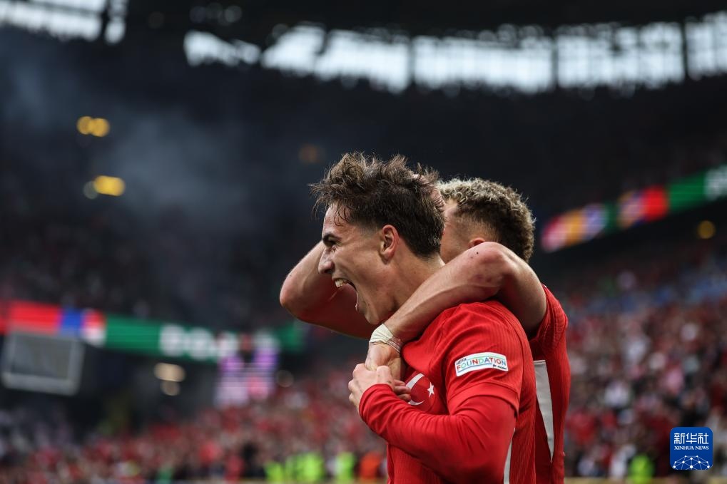 6月18日,土耳其队球员伊尔迪兹(左)在进球后庆祝,随后主裁判根据VAR(视频助理裁判)判定该进球无效。新华社记者 潘昱龙 摄