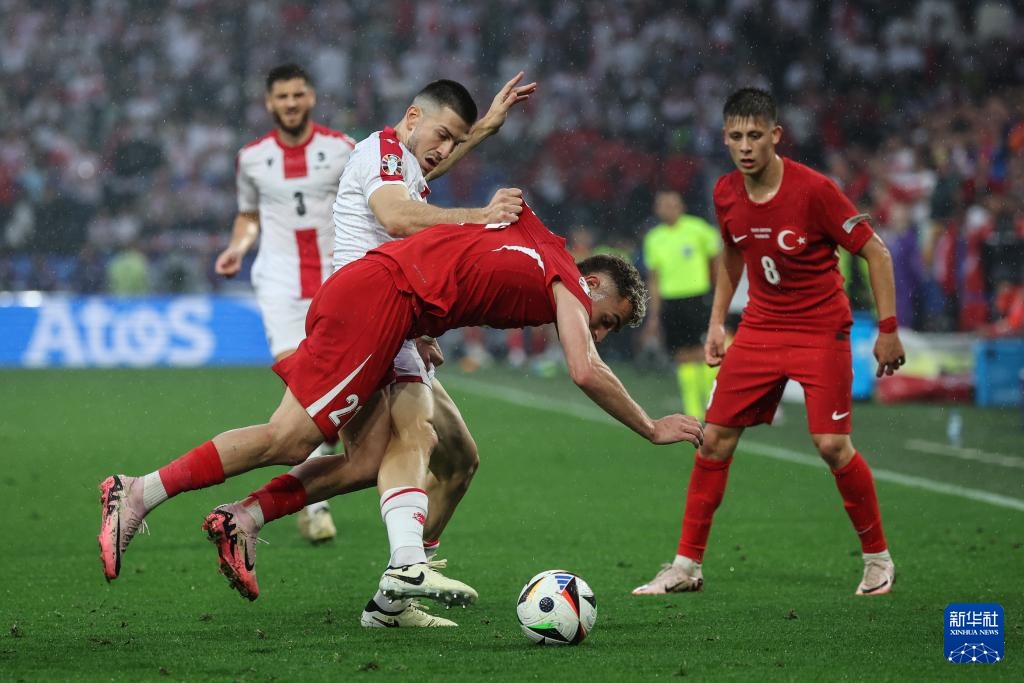 6月18日,格鲁吉亚队球员洛乔什维利(左二)与土耳其队球员伊尔马兹(右二)拼抢。新华社记者 潘昱龙 摄