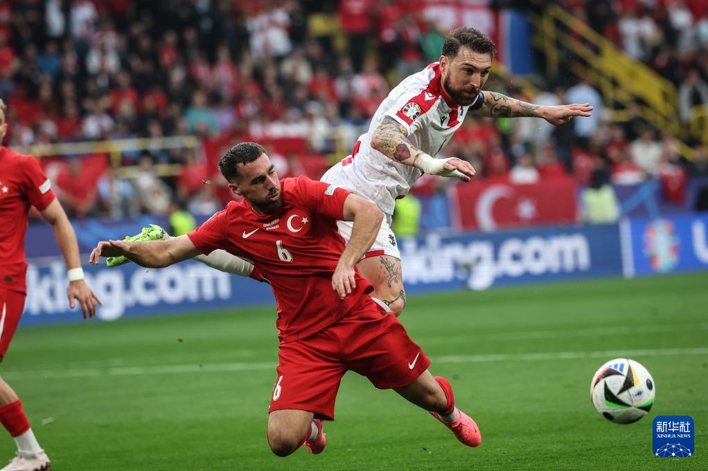 6月18日,格鲁吉亚队球员古拉姆·卡夏(右)与土耳其队球员奥尔昆·科克苏拼抢。新华社记者 潘昱龙 摄