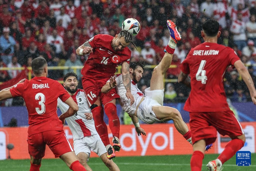 6月18日,土耳其队球员德米拉尔(右二)与格鲁吉亚队球员日夫齐瓦泽(右一)争抢头球。新华社记者 潘昱龙 摄