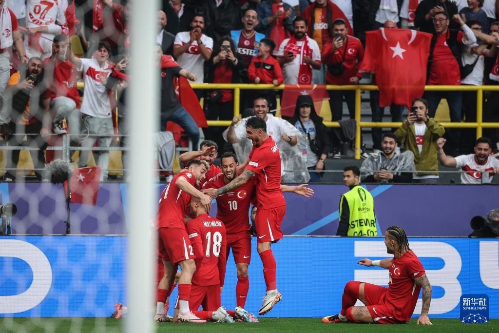 6月18日,土耳其队球员穆尔杜尔(18号)进球后与队友庆祝。新华社记者 潘昱龙 摄