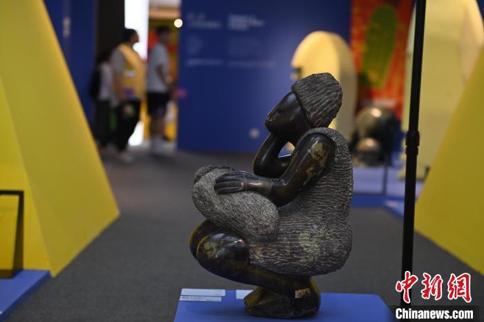 6月19日,真石与幻梦·非洲津巴布韦石雕艺术展在甘肃兰州开展。该展览遴选近百件津巴布韦艺术家的石雕艺术作品,蕴含着津巴布韦的文化和古老传说,体现了津巴布韦的悠久历史。图为游客拍摄蛇纹石作品《贵妇人》。中新社记者 李亚龙 摄