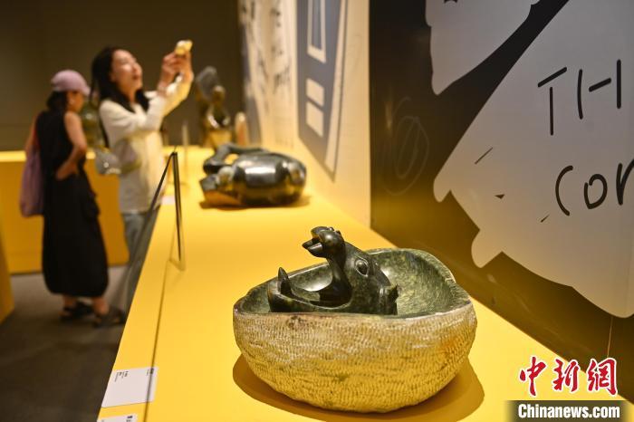 6月19日,真石与幻梦·非洲津巴布韦石雕艺术展在甘肃兰州开展。该展览遴选近百件津巴布韦艺术家的石雕艺术作品,蕴含着津巴布韦的文化和古老传说,体现了津巴布韦的悠久历史。图为该艺术展展陈的蛇纹石作品《河马池》。中新社记者 李亚龙 摄
