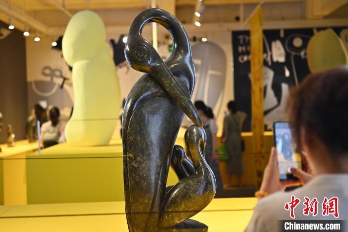 6月19日,真石与幻梦·非洲津巴布韦石雕艺术展在甘肃兰州开展。该展览遴选近百件津巴布韦艺术家的石雕艺术作品,蕴含着津巴布韦的文化和古老传说,体现了津巴布韦的悠久历史。图为游客拍摄蛇纹石作品《依恋》。中新社记者 李亚龙 摄