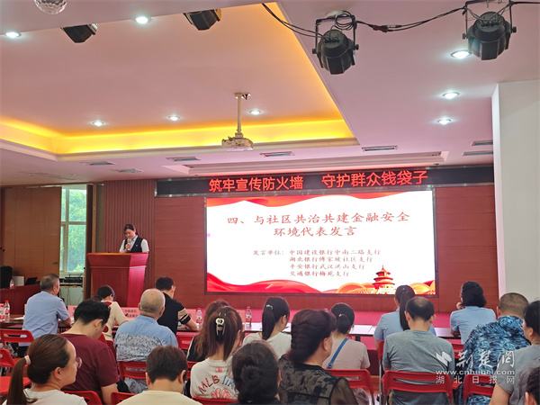 汉口银行百瑞景支行相关负责人宣讲了非法吸收公众存款、非法集资的手段和危害,介绍银行在防范金融风险方面的措施,引导广大群众保持警惕,树立正确理财观念,自觉远离非法集资,守护好自己的“钱袋子”。中国建设银行中南二路支行、湖北银行傅家坡社区支行代表表态发言将会积极参与到反诈工作中,与街道、社区共治共建金融安全环境;平安银行武汉洪山支行、交通银行梅苑支行代表讲述金融反诈相关案例和具体举措,表示会积极与社区联合开展宣传活动,为共建和谐稳定的社会环境贡献力量。