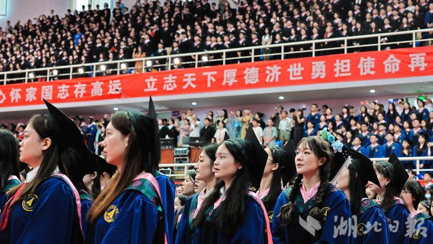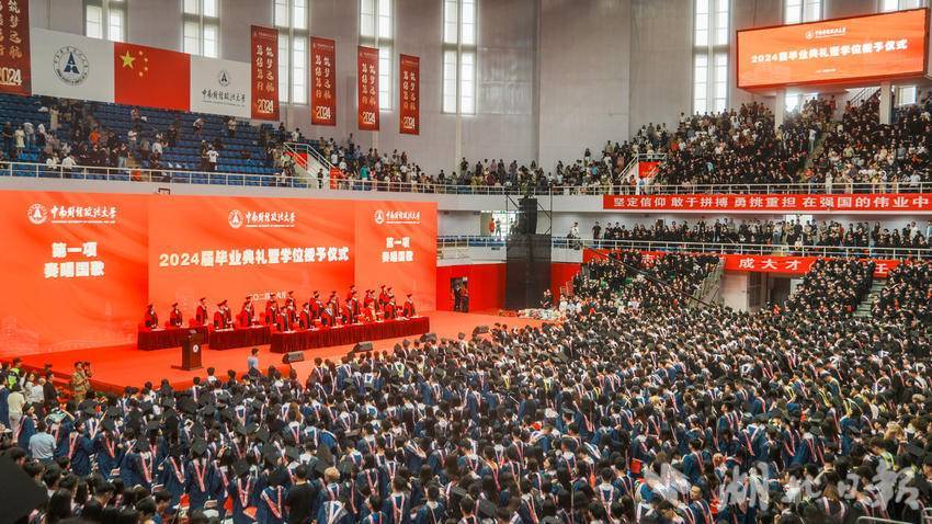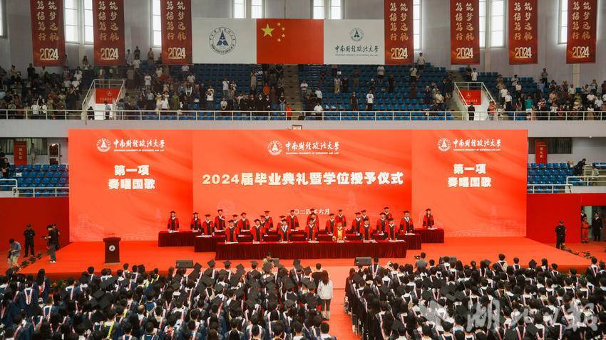 6月20日,中南财经政法大学2024届毕业典礼暨学位授予仪式在该校南湖校区艺体中心盛大举行。现场数千名毕业生身着学位服齐聚一堂,告别校园,奔赴未来。(湖北日报全媒记者 何宇欣 通讯员 卓张鹏 实习生 赵博新 摄)