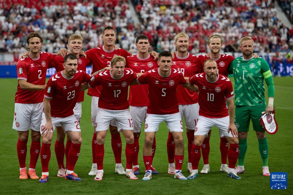 6月20日,丹麦队首发球员在比赛前合影。新华社记者 孟鼎博 摄