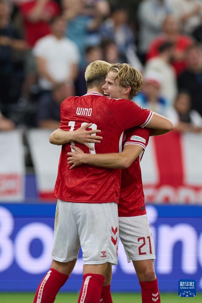 6月20日,丹麦队球员摩顿·尤尔曼(右)与队友温德在比赛中庆祝进球。新华社记者 孟鼎博 摄